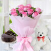 Bouquet of 25 Red, pink and white color roses in paper packing along with 1/2 Kg black forest Cake & 6 Inch Teddy Bear