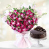 Arrangement of 30 stems of Pink Roses with greens in a Basket along with 1/2 Kg Chocolate Cake