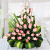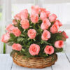 Flower arrangement of 60 stems of red roses with fillers in a basket.