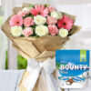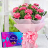 Bouquet of 12 stems of Red Roses with fillers in nice wrapping and Dairy milk mini pack